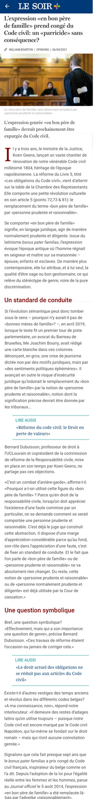 W. BOURTON, ‘L’expression « en bon père de famille » prend congé du Code civil : un « parricide » sans conséquence ?’, Le Soir, Bruxelles, 06/04/2021.